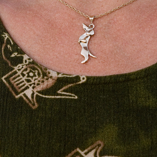 This wonderful pair of 14k solid gold dachshund earrings is playful and fun, an appealing way to show off the affinity you have for a great little dog! Each earring is 1" tall and 3/8" wide.