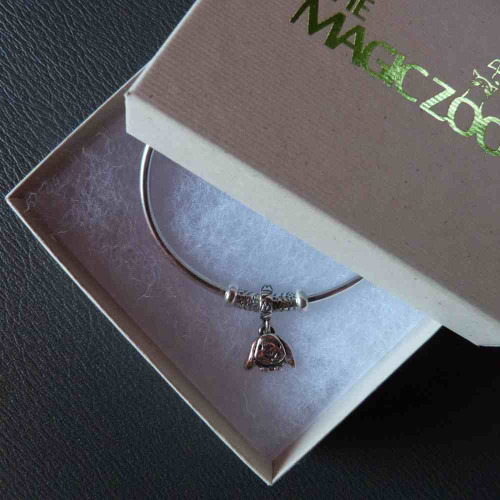 There are few things quite as endearing as a Great Dane with natural ears. I love their long-legged overall friendly “bigness!” So this, my friend, is for you, the Great Dane lover. This Great Dane charm is attached to my own unique Magic Zoo European-style bead. This sterling silver bead and charm is slipped onto the sterling silver European-style flex bracelet. Next two decorative sterling silver beads are added to either side of the Magic Zoo bead. To finish off the design and keep every thing in place, 2 shiny silver stopper beads are placed on either side of the decorative beads. It will come to you assembled and ready to wear! The little balls on either end of the flex bracelet screw on and off. That way you can add additional beads whenever you want. The bracelet is 7 1/2” and fits most wrist sizes up to a medium. Would you like a different sterling silver Magic Zoo animal charm on your bracelet? Contact me through the website, or call me at 800-670-3703. Any one of my sterling silver charms can be made into a lovely European-style bracelet similar to the one you see here.